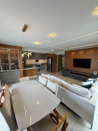 -149M² -Mobiliado e decorado -03 suítes sendo a master com closet -Nascente -Andar alto -Elevador privativo -Sala de Tv , jantar e cozinha -Área de serviço separada -Banheiro de serviço -Varanda com churrasqueira -Lavabo -Roupeiro -Marcenaria de alto padrão -Sala com 2 ambientes e ar-condicionado K7 -Sistema de som e Wi-Fi independentes -Eletrodomésticos novos Condomínio com lazer completo: Piscina, sauna, academia, quadra poliesportiva, espaço gourmet, playground, portaria 24h