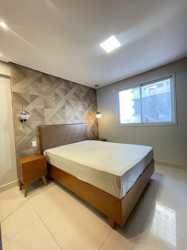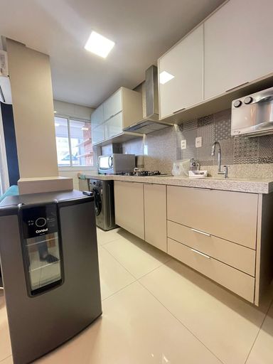 Relação da mobília:b01-Cama casal , 02- Criados , 01- chuveiro , 01- espelho redondo banheiro , 01- sofá , 01- mesa redonda de madeira com 4 cadeiras 01- ar condicionado 18 mil btus, 01- mesa centro de vidro com inox, 01- microondas, 01- purificador de ar, 01- fogão cooktop, 01- geladeira duplex inox, 01- coifa , 01- lavadora roupas, 02- cadeiras de corda sacada, 01- Tv de 40 polegadas.
